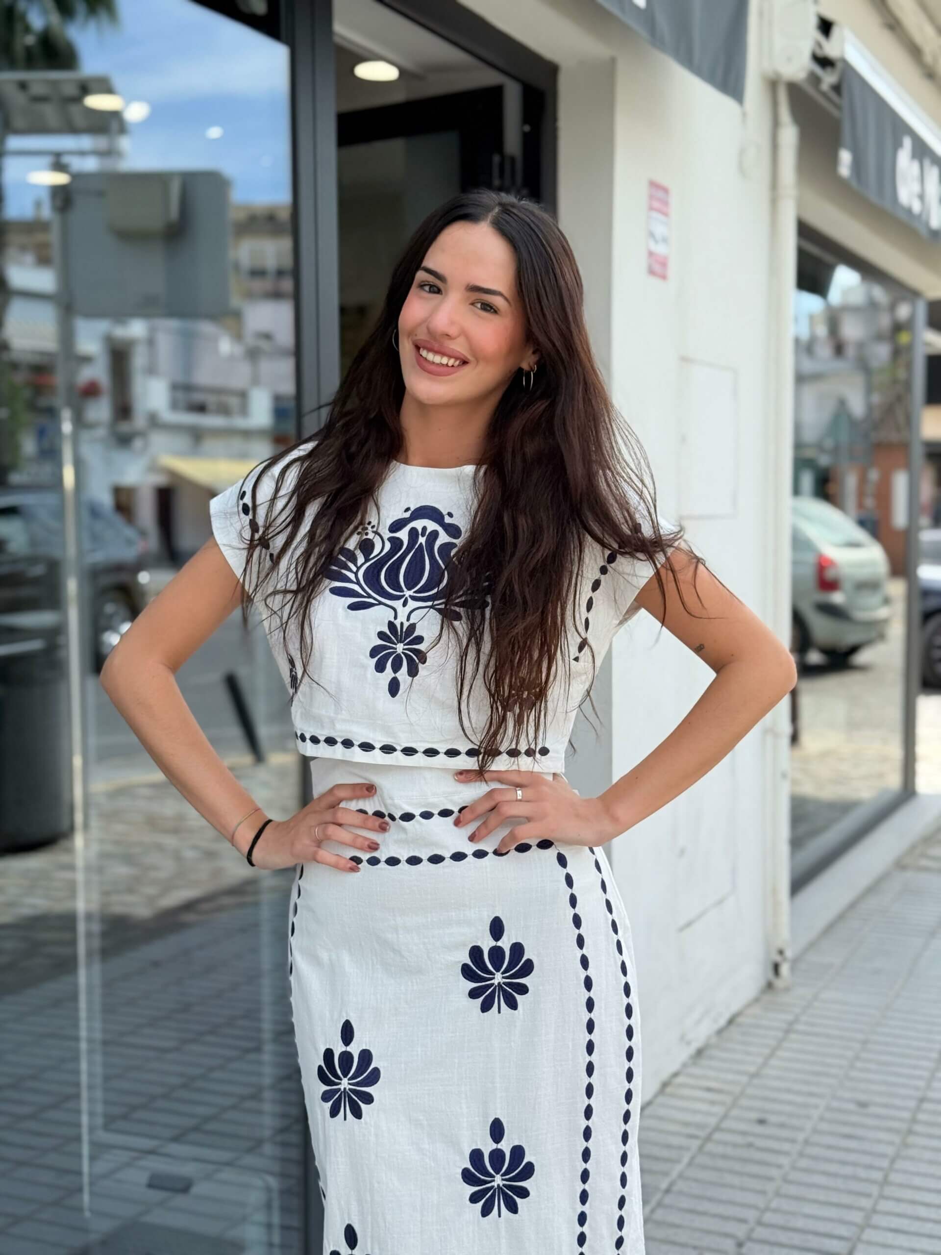 Este conjunto blanco de lino con bordados florales en azul marino es la definición de frescura y estilo mediterráneo.