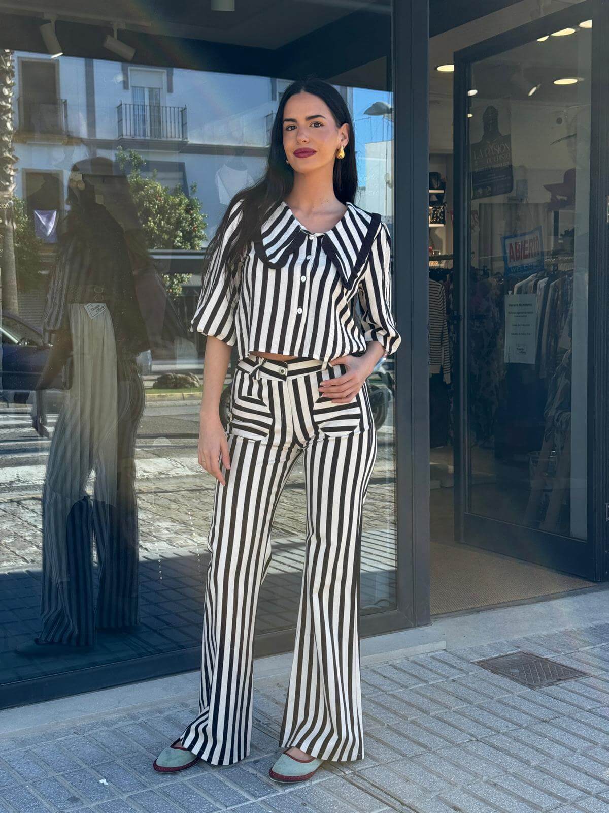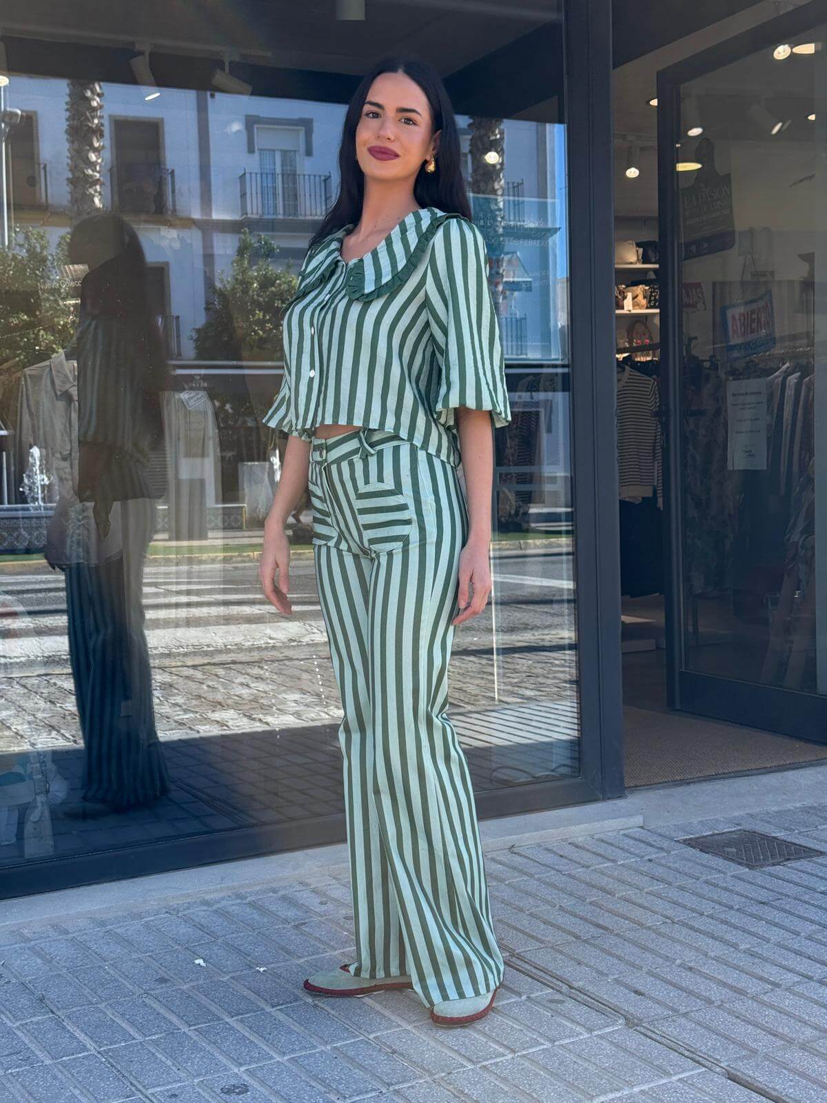 Conjunto de rayas formado por blusa corta con cuello amplio y pantalón de tiro alto. Disponible en verde y negro. Elegante, cómodo y muy favorecedor.
