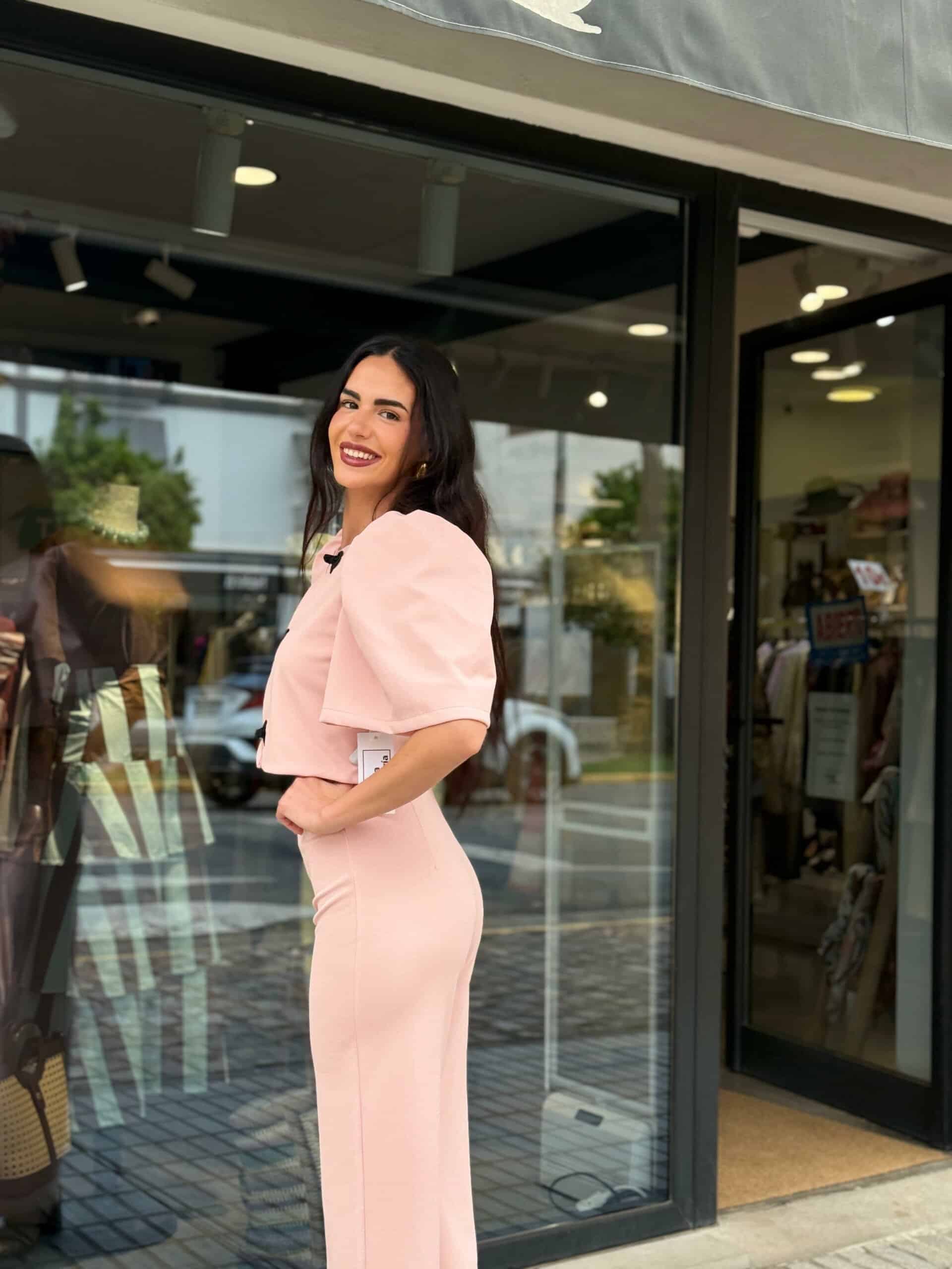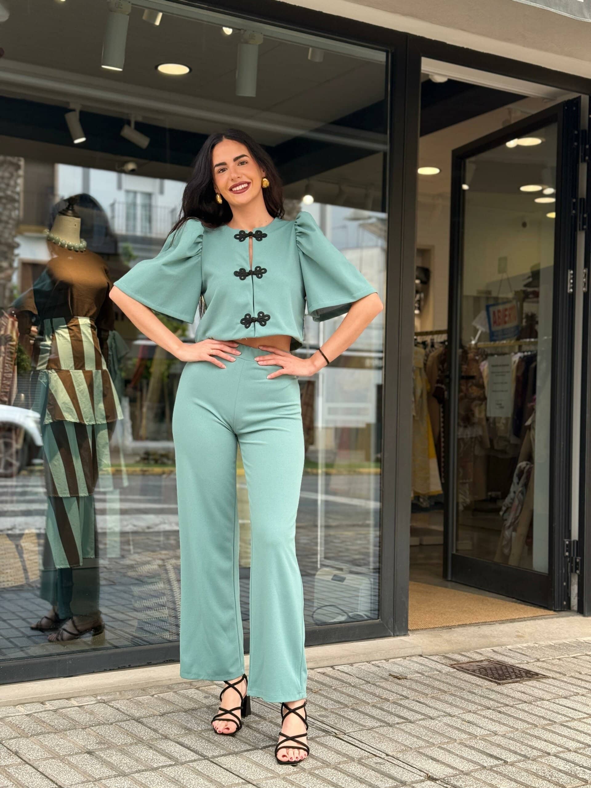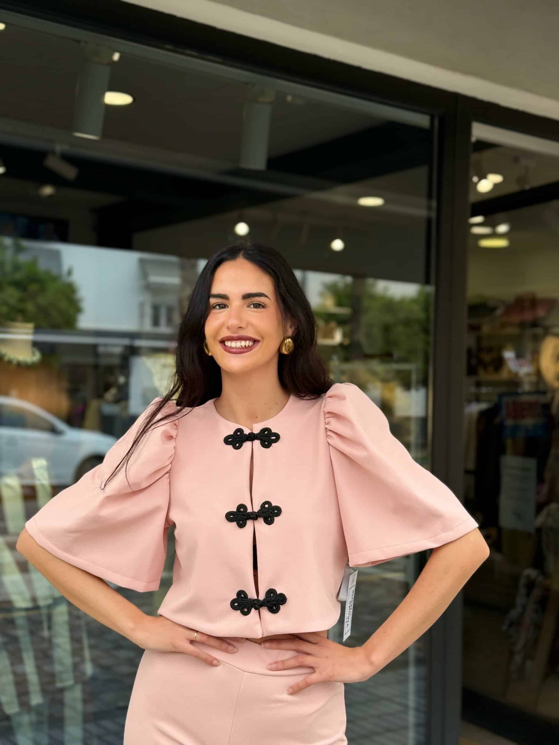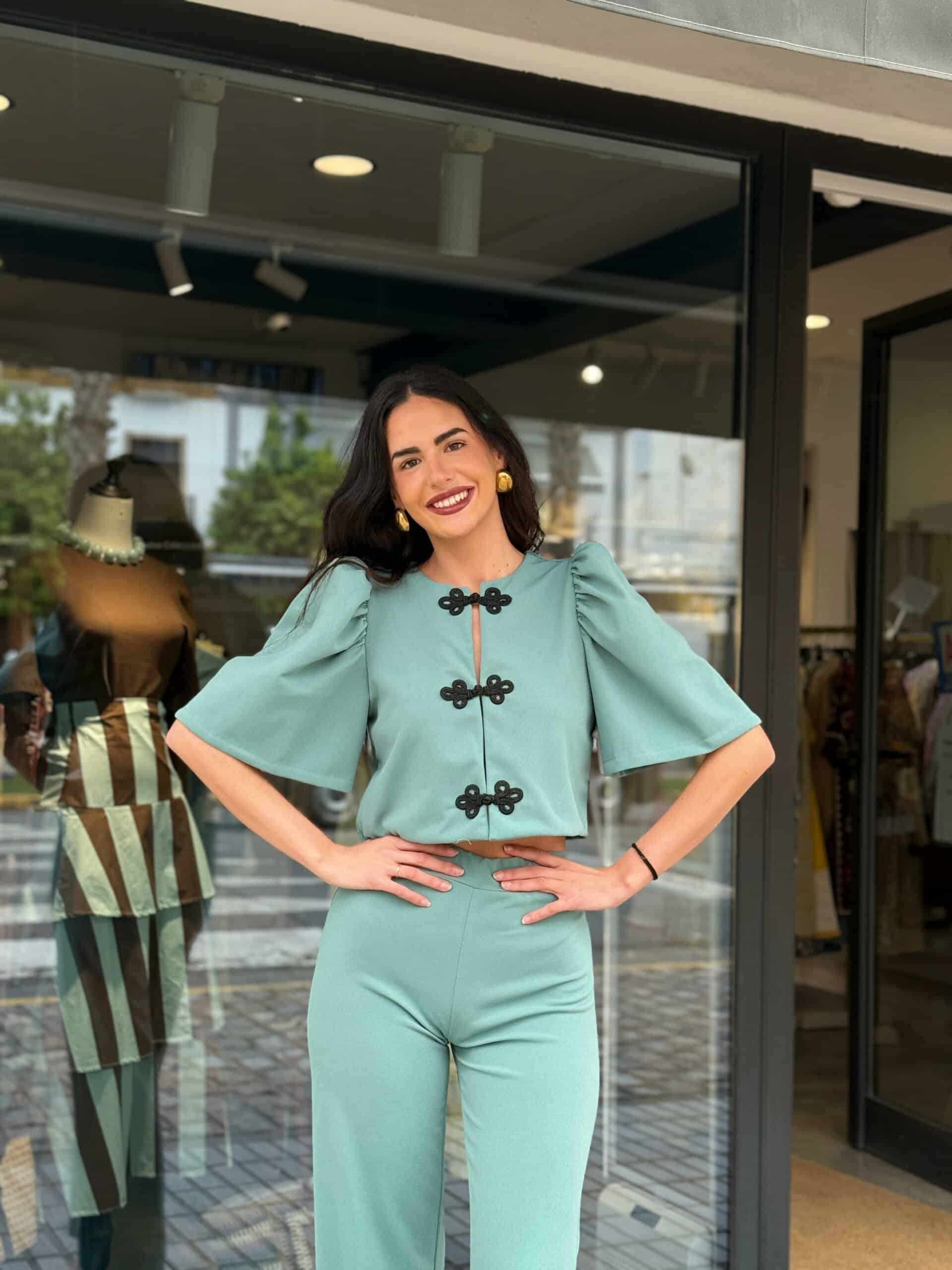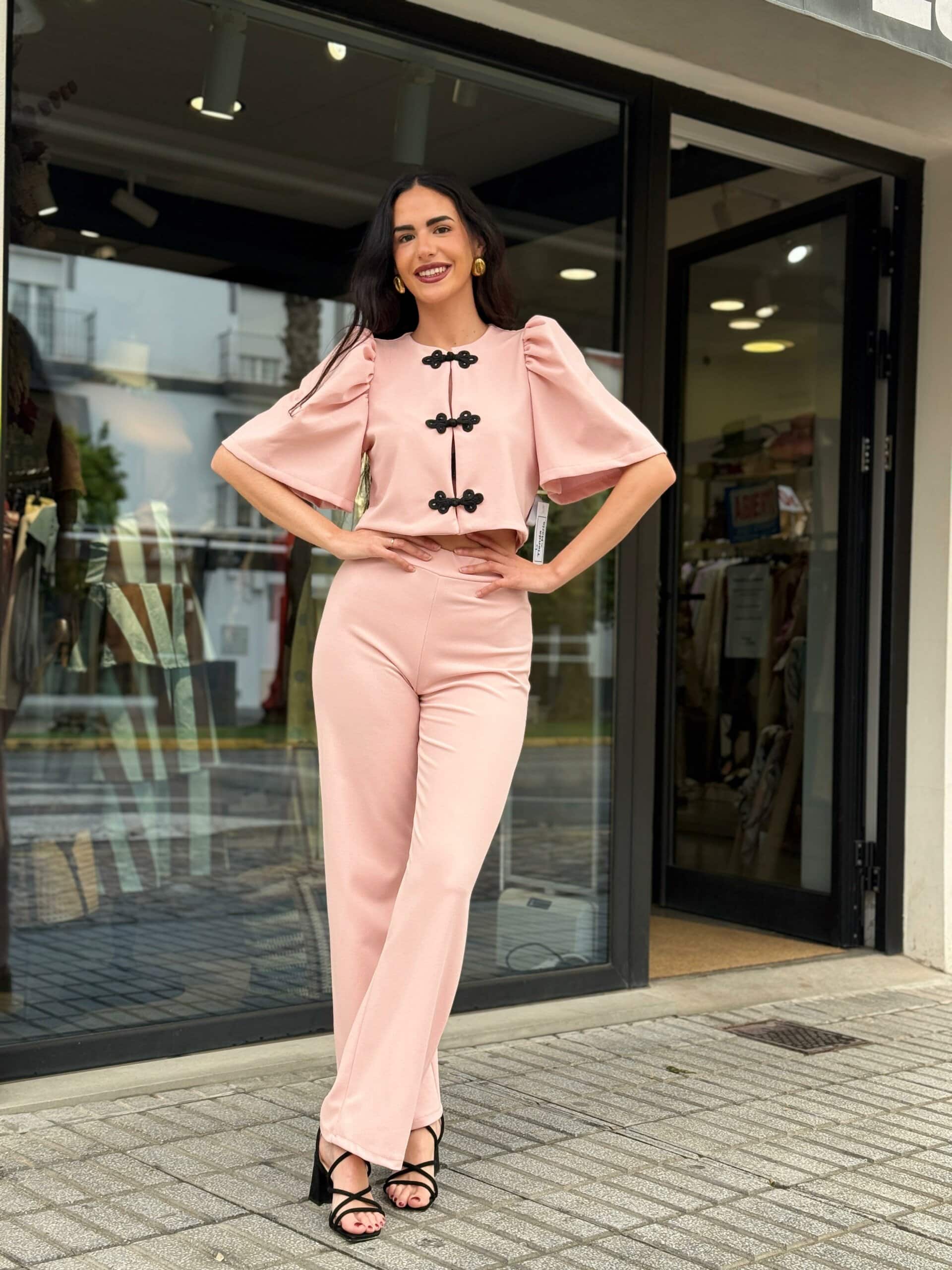 El top incorpora originales cierres decorativos en contraste, aportando un toque especial y diferenciador que eleva el conjunto. Las mangas con volumen añaden movimiento y un aire romántico, mientras que el pantalón, de caída ligera, acompaña la silueta creando un look equilibrado y elegante.