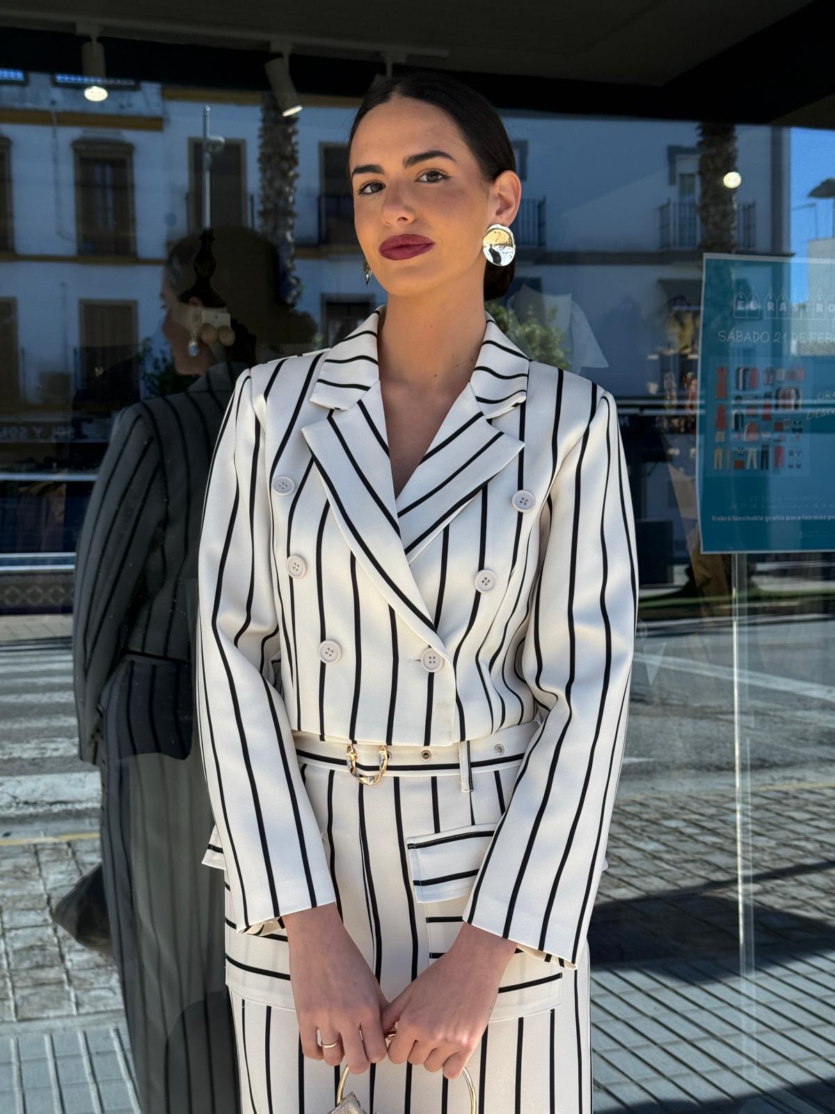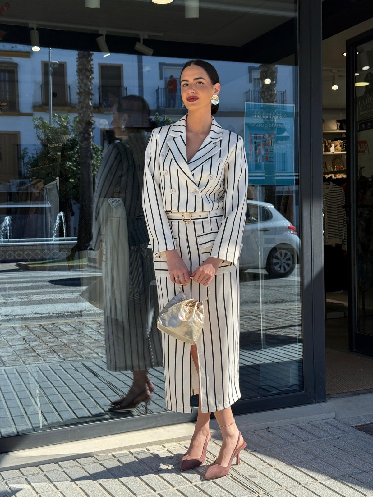 El conjunto Teresa es una apuesta segura si buscas un look sofisticado y con personalidad. Un dos piezas compuesto por chaqueta de corte estructurado y falda midi a juego en estampado de rayas blanco y negro.