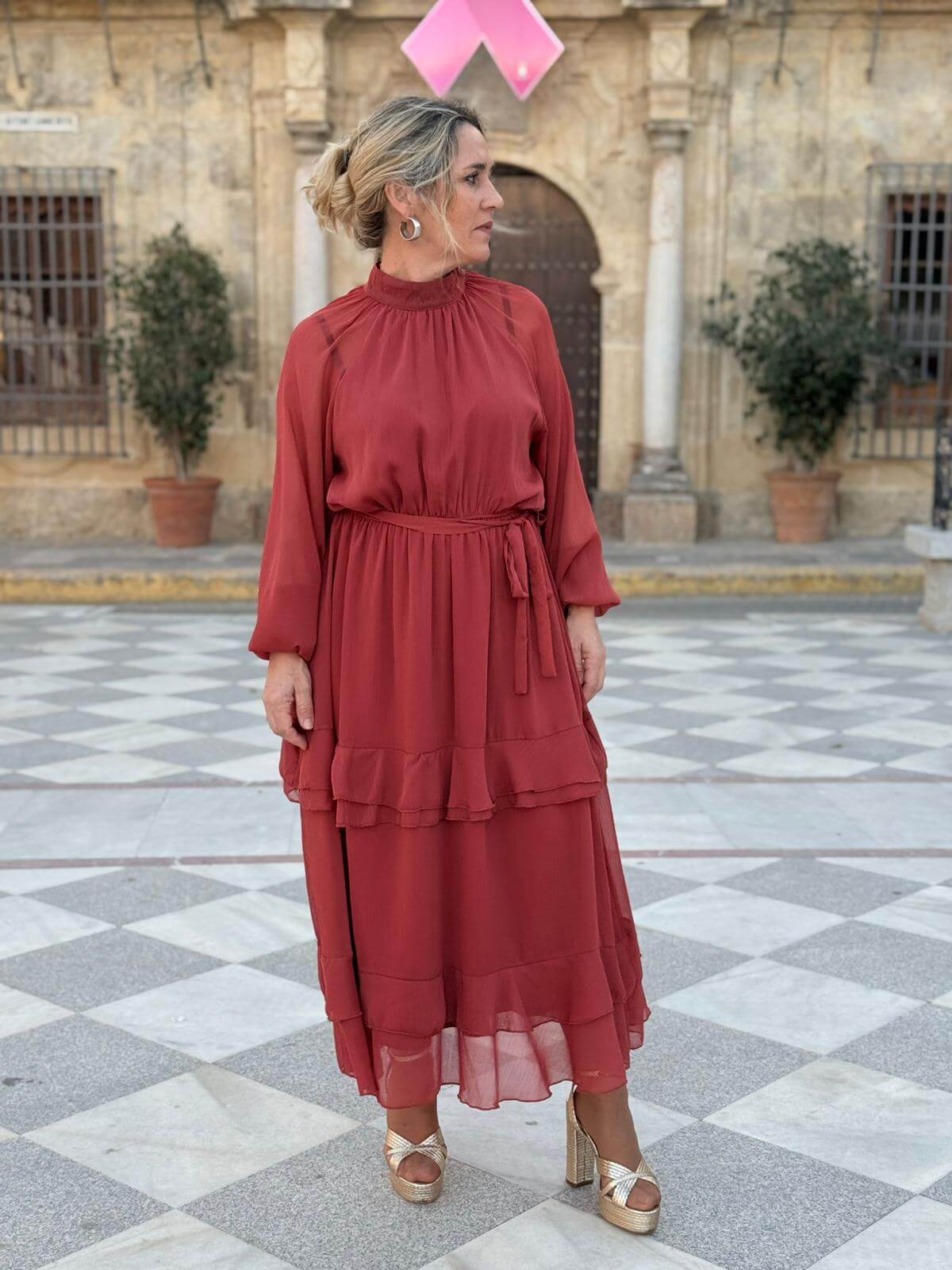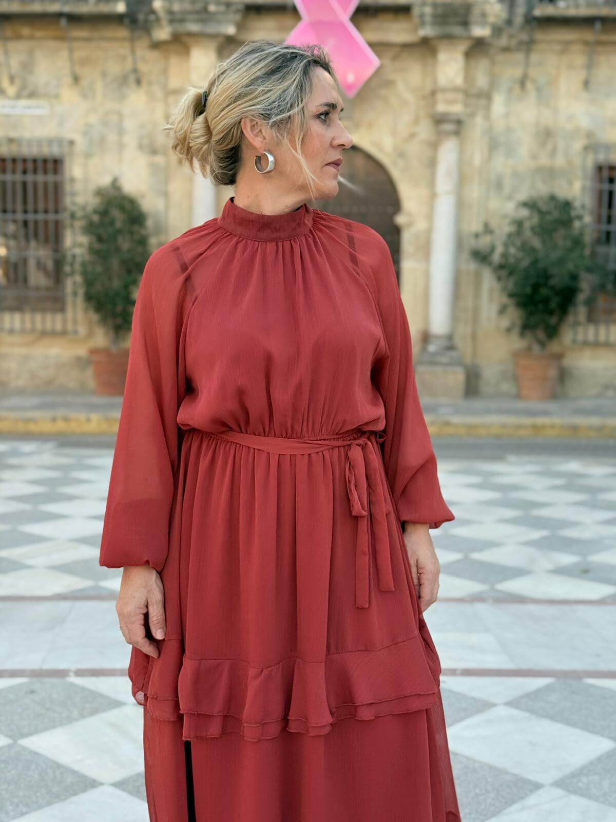 Este vestido midi terracota con cuello alto destaca por su elegancia atemporal y su favorecedor corte con caída fluida.