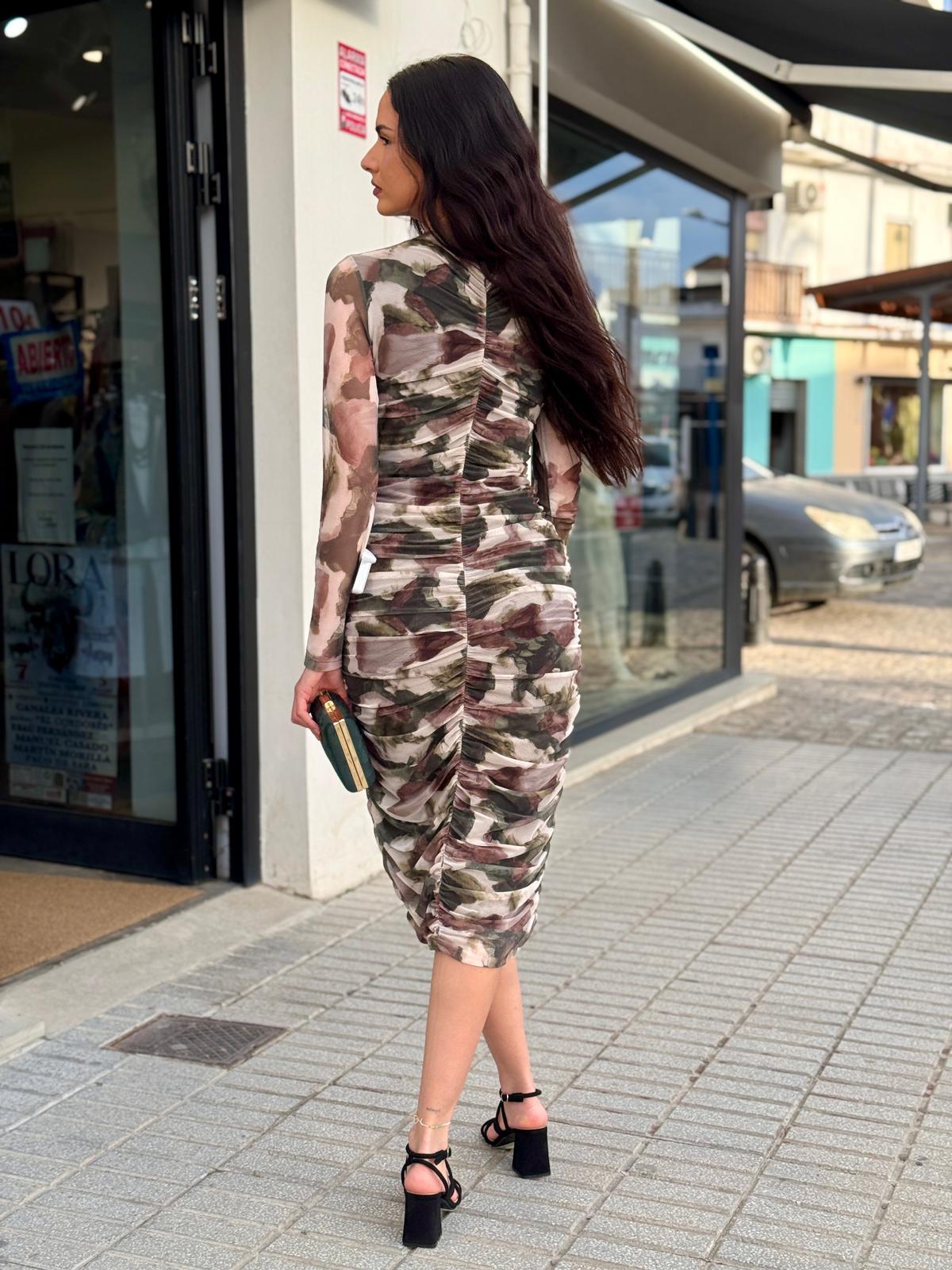 Confeccionado en tejido elástico con acabado semitransparente en mangas, se adapta cómodamente al cuerpo marcando una línea femenina y elegante. Su largo midi lo convierte en una opción ideal para eventos, cenas especiales o celebraciones.