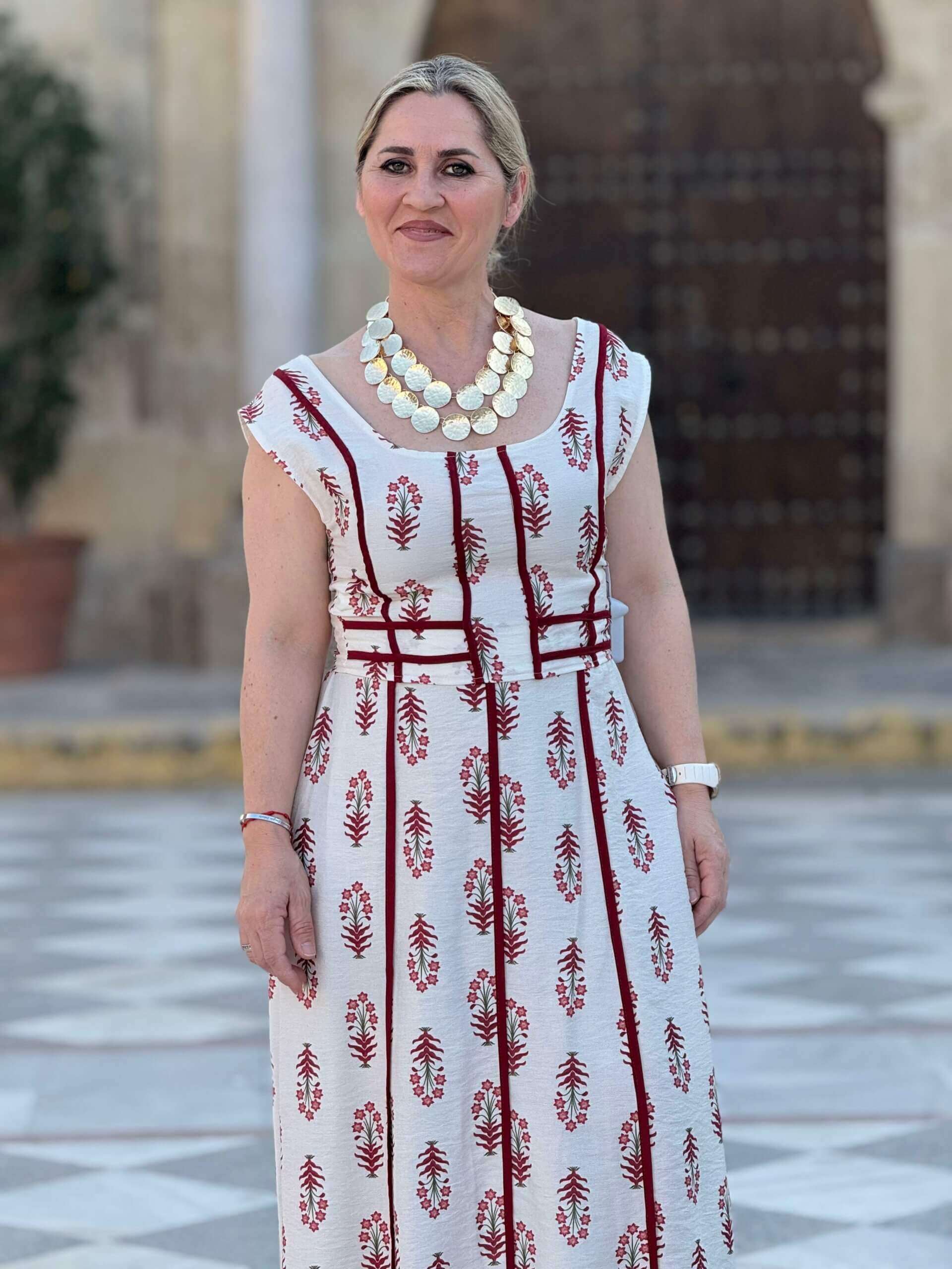Este vestido largo en color blanco, decorado con un elegante estampado floral en tonos burdeos, es la combinación perfecta entre frescura y distinción. Con un corte recto que alarga la silueta y detalles geométricos en líneas burdeos, aporta un toque moderno sin perder la esencia clásica.