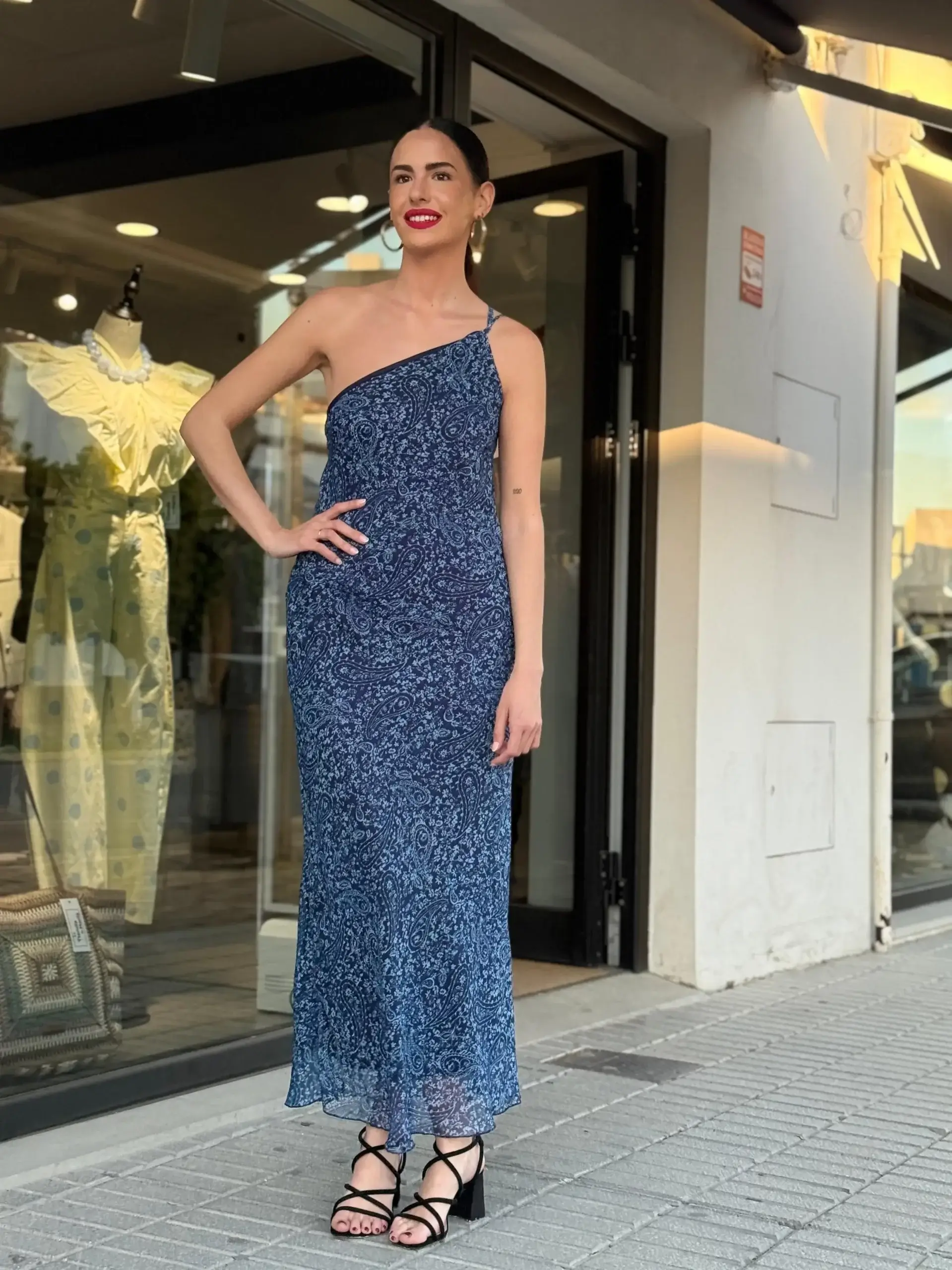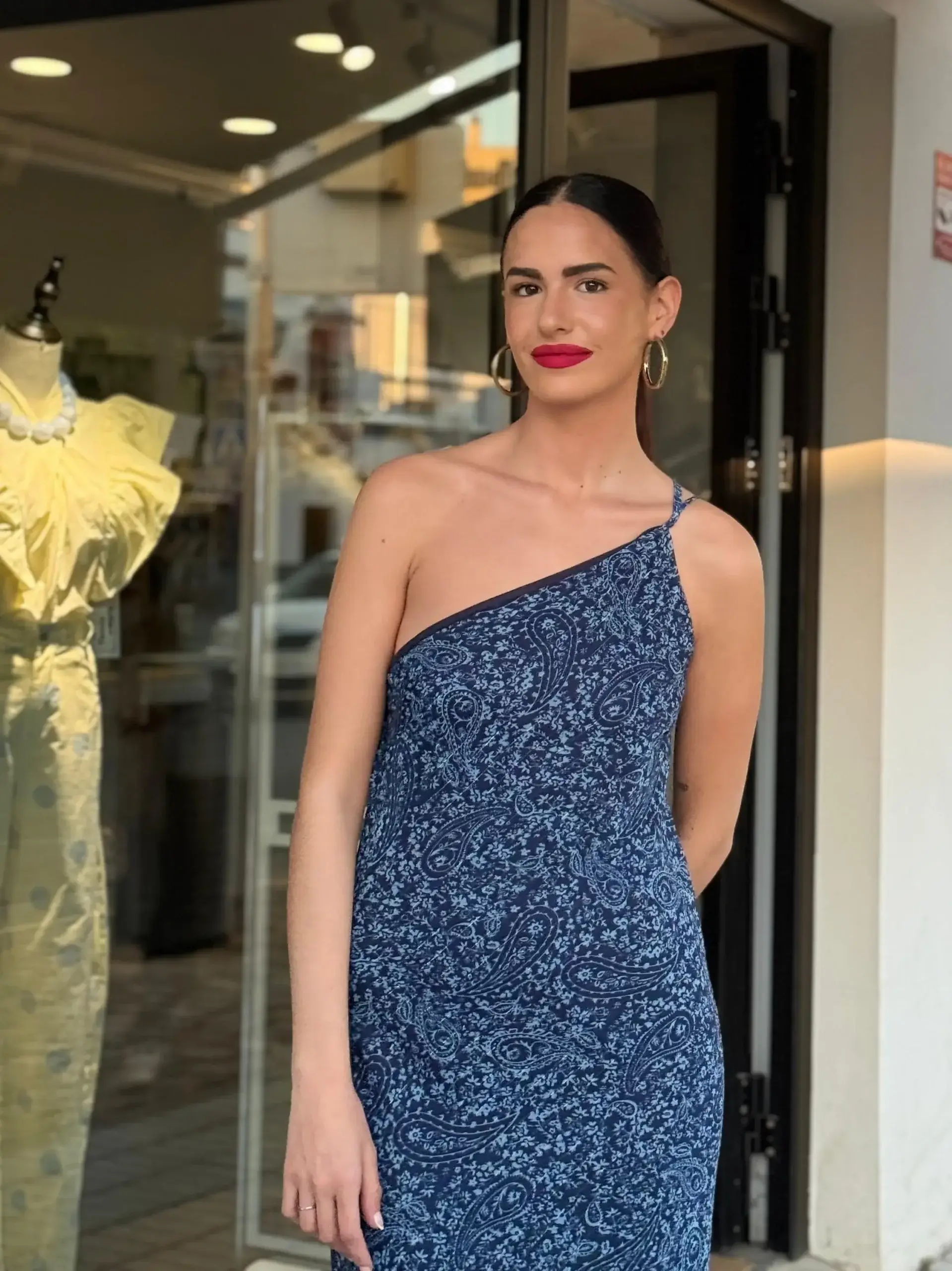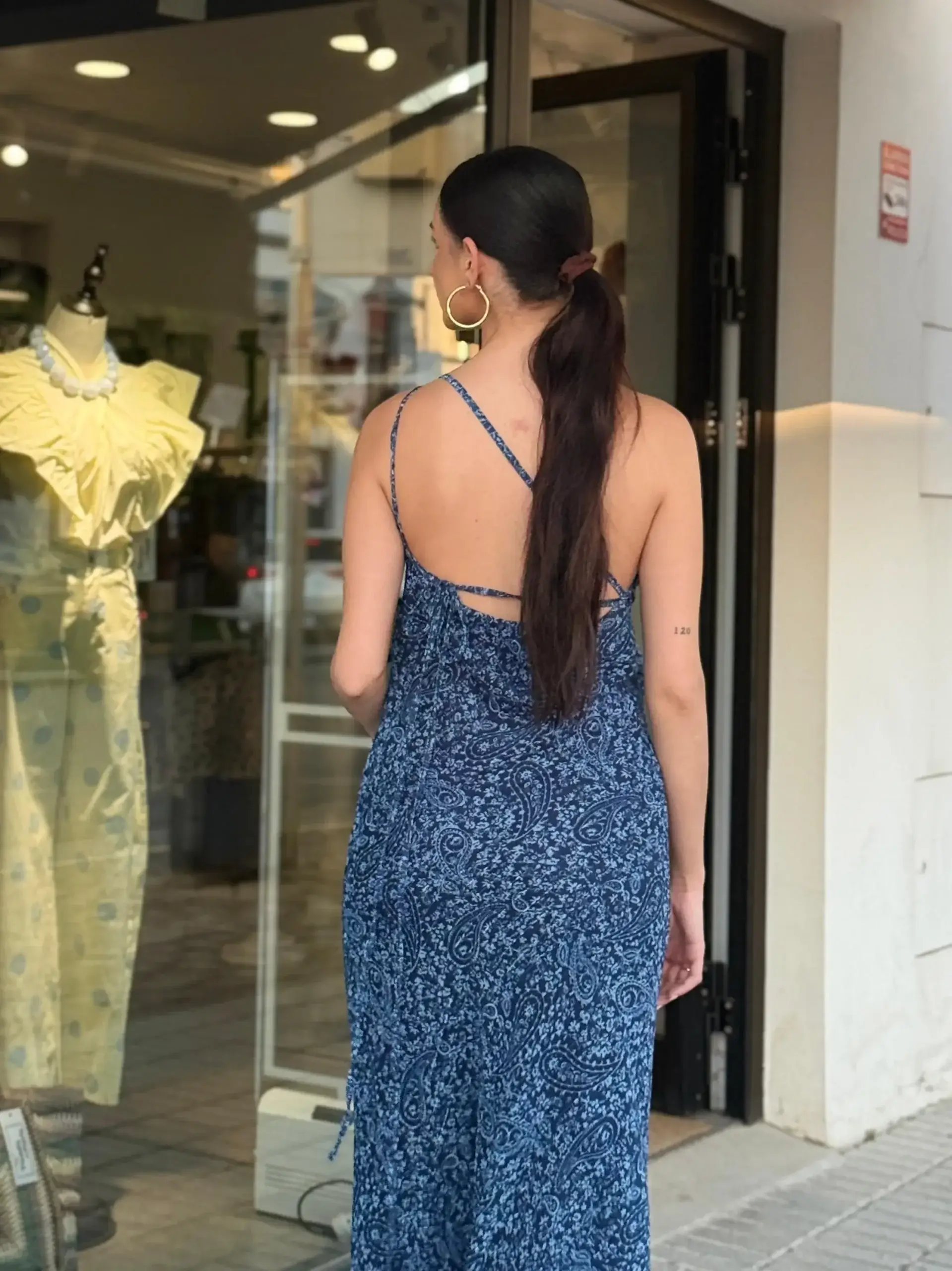 El tejido ligero con estampado tipo paisley en tonos azules envuelve el cuerpo con suavidad, adaptándose de forma natural y realzando la figura sin marcar. Su caída fluida y recta alarga visualmente la silueta, mientras que la espalda con finos tirantes cruzados añade un detalle delicado y atractivo.