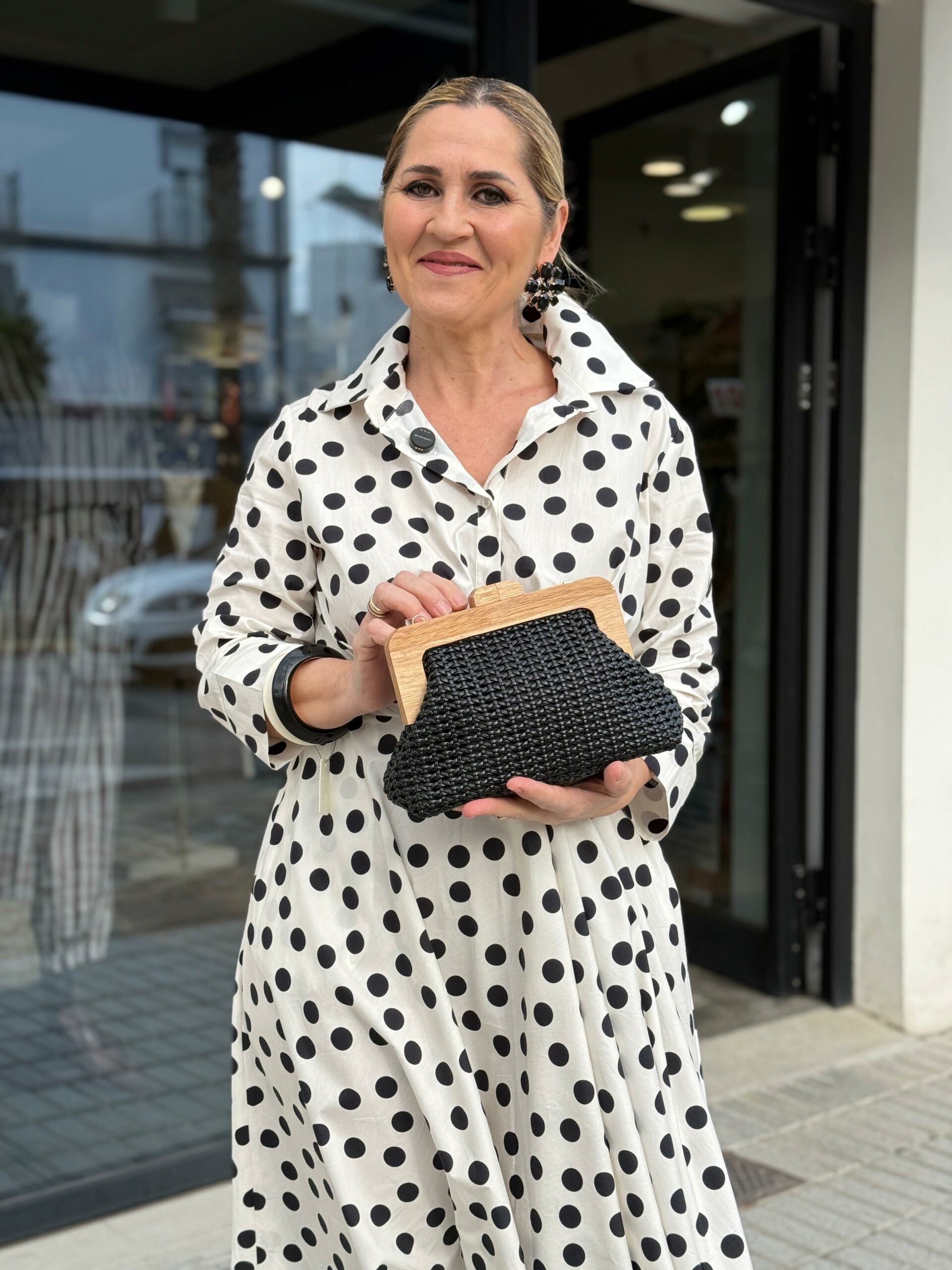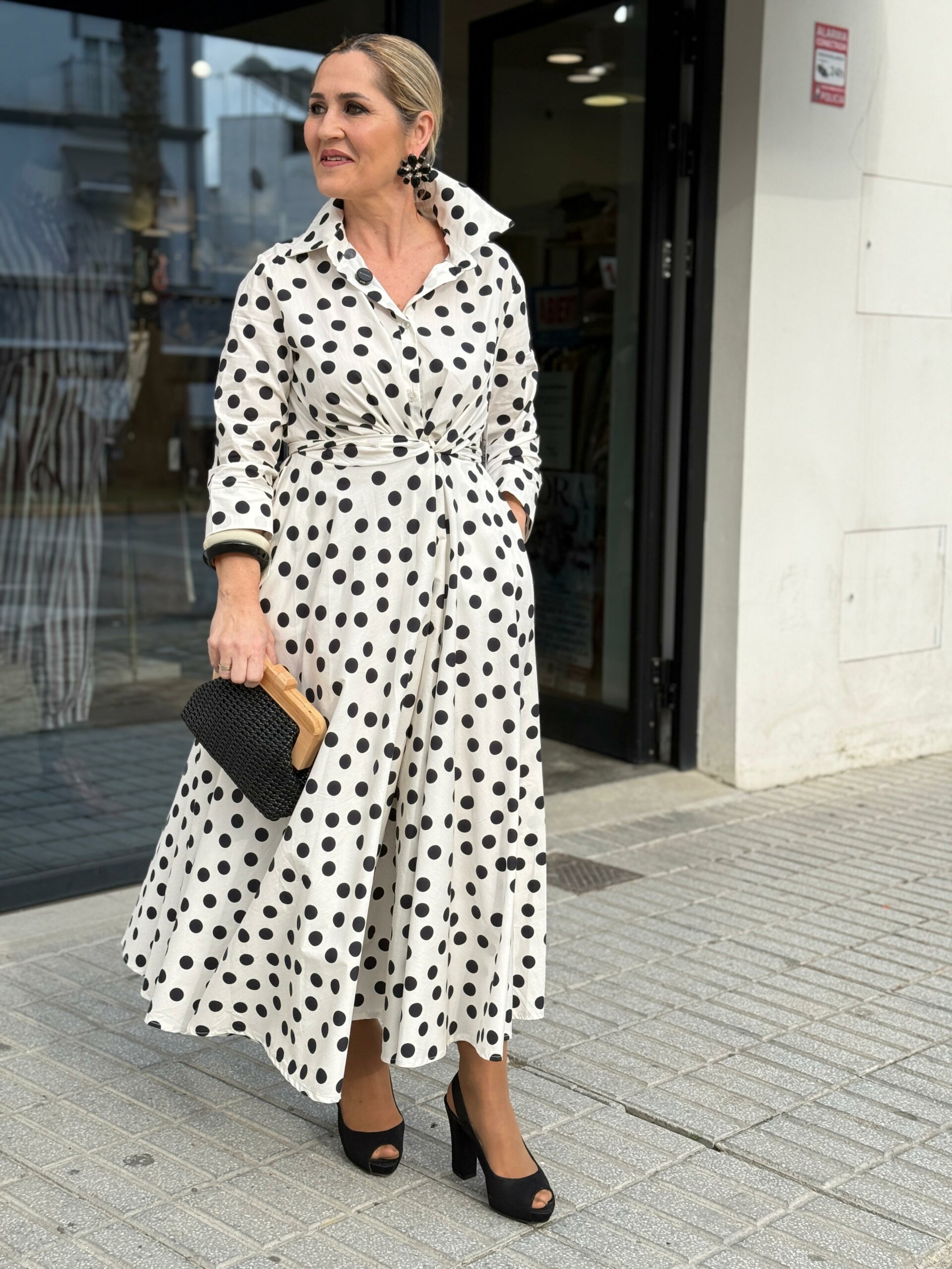 Es un vestido ideal para combinar con salones negros, sandalias de tacón o accesorios en rafia y madera para un acabado más original y sofisticado. El vestido Cruela lunares tiene ese encanto especial de las prendas que elevan cualquier armario y convierten un estilismo sencillo en un look inolvidable.