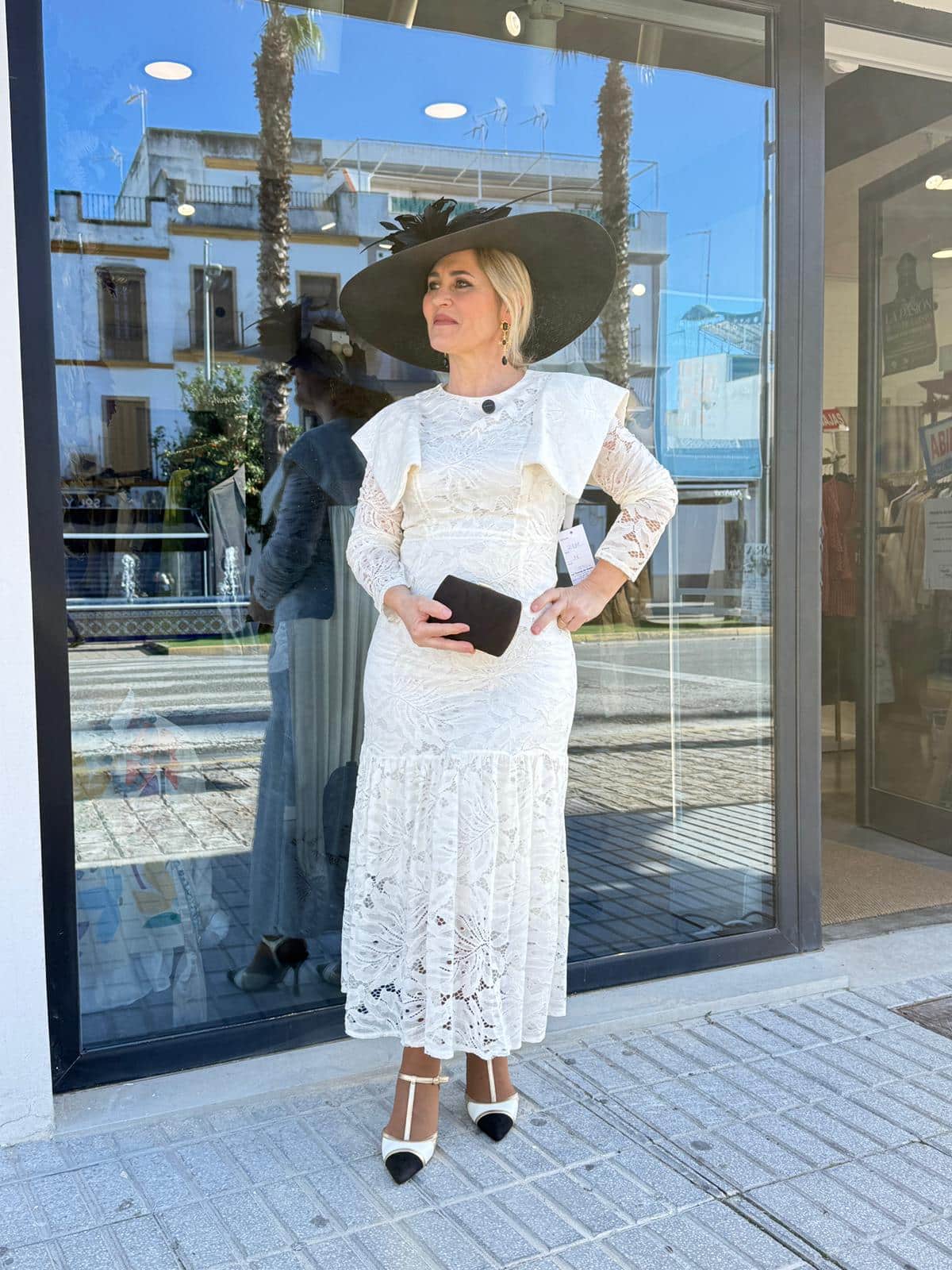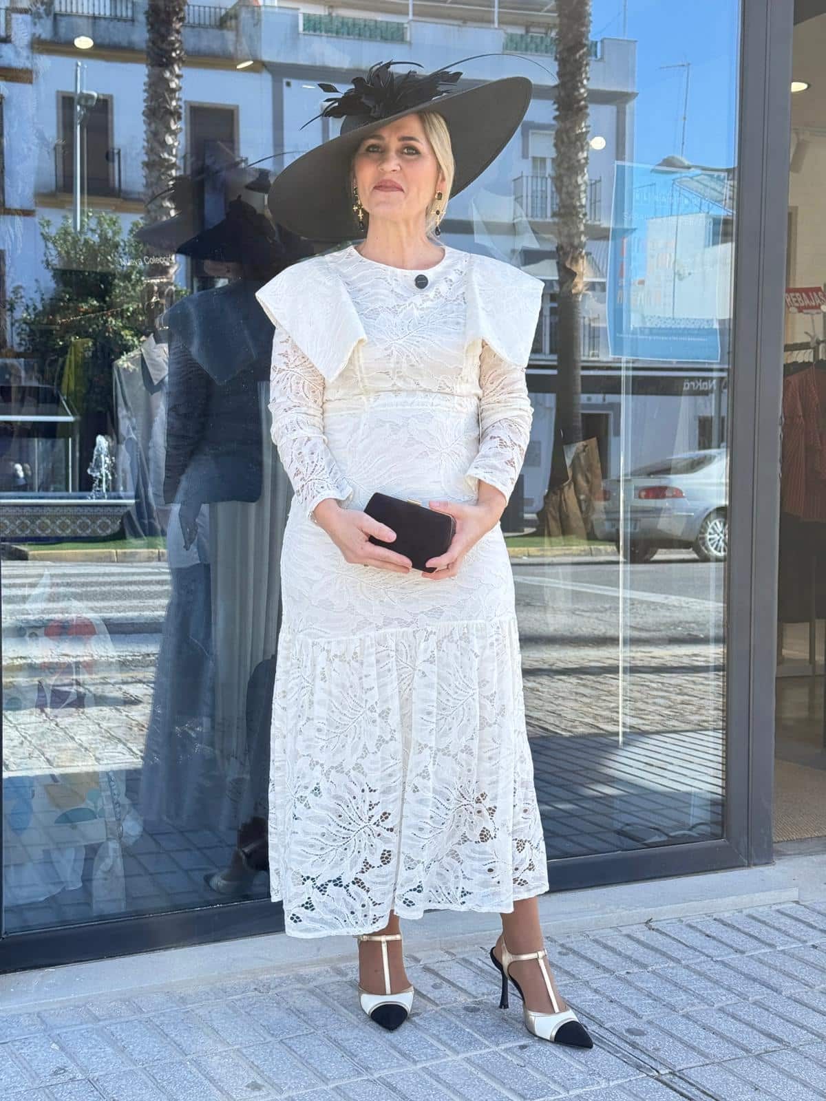 Es una opción perfecta para comuniones, bautizos, bodas de día o eventos especiales. Puedes combinarlo con complementos negros para un contraste elegante o con tonos dorados para un look más cálido. En las imágenes, la modelo lo combina con los pendientes cruz negro oro y el bolso kuqui dorado, logrando un estilismo sofisticado y actual.