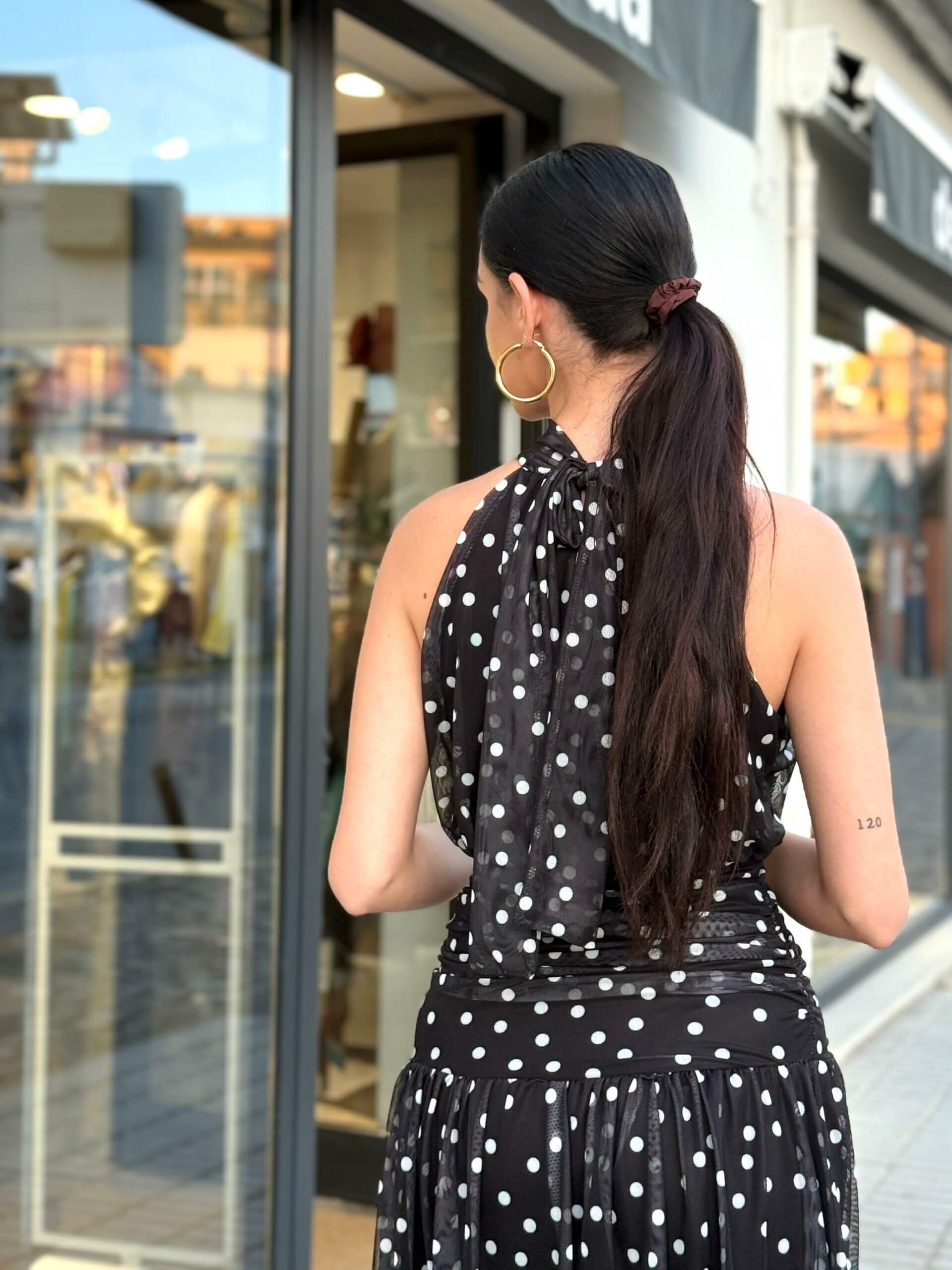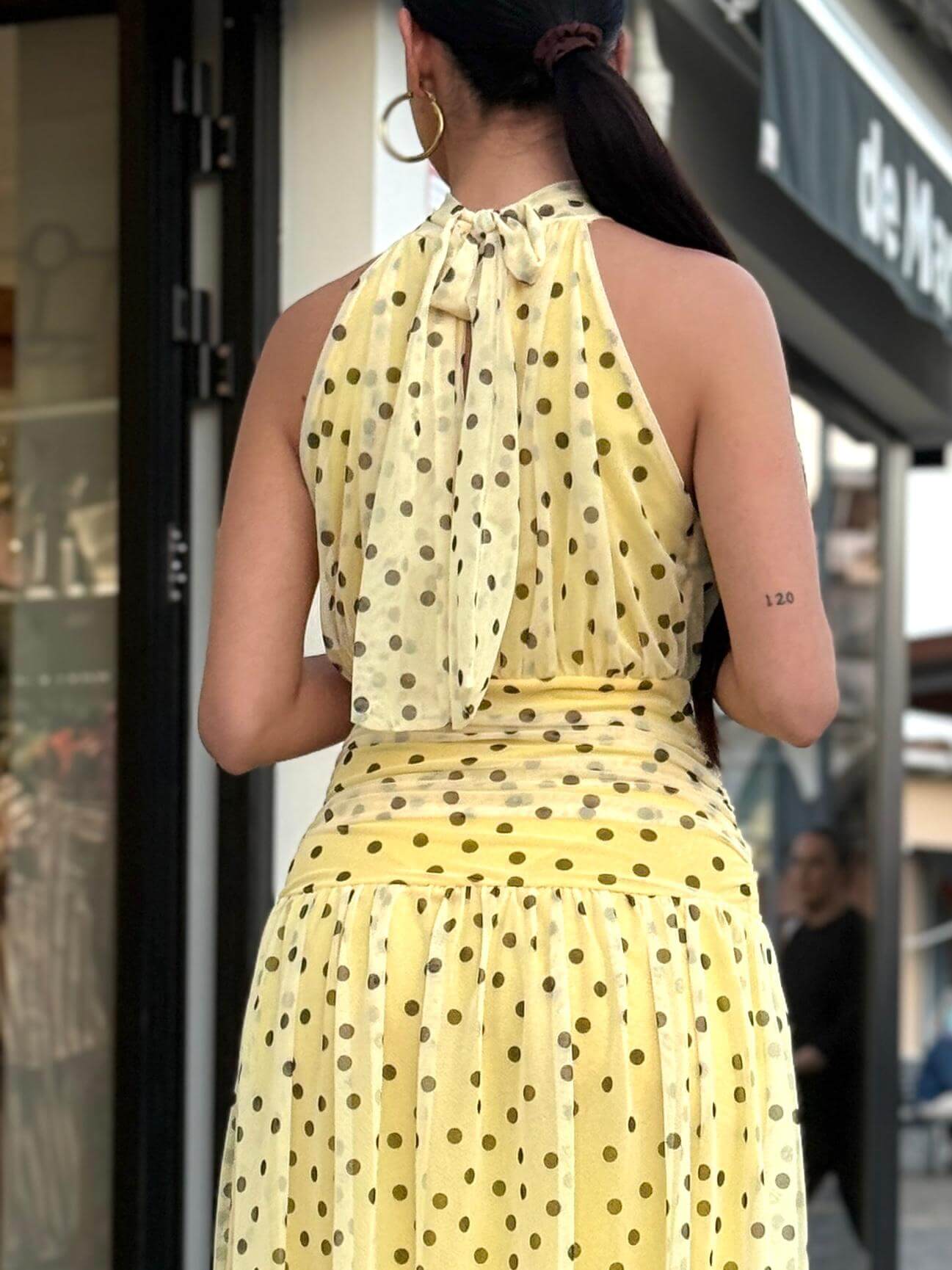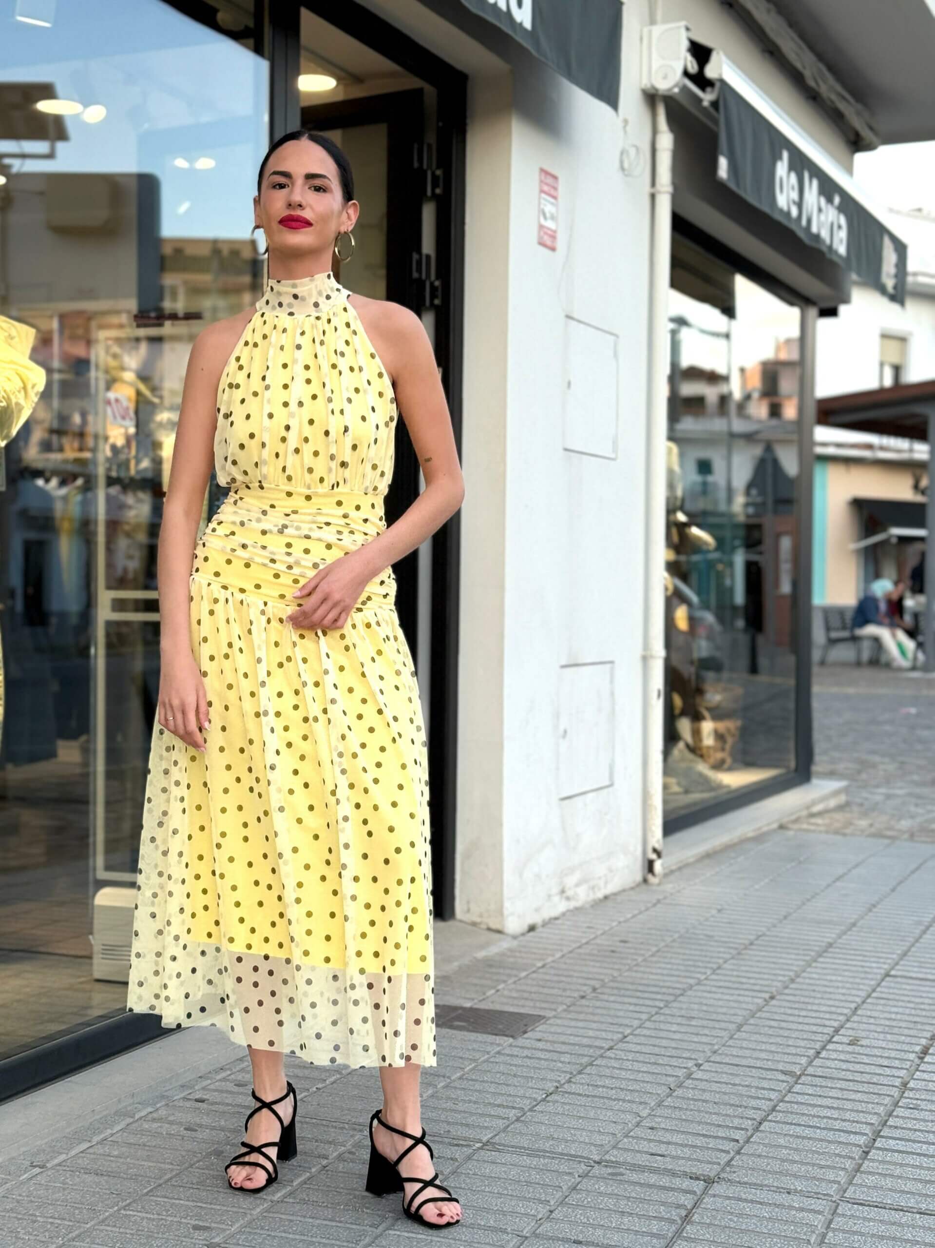 Confeccionado en un tejido ligero con caída suave y acabado semitransparente en la capa exterior, este vestido destaca por su estampado de lunares y su silueta fluida. La zona de la cintura presenta un efecto fruncido que define la figura con delicadeza, mientras que la falda midi aporta movimiento y un resultado visual muy estilizado. Está disponible en negro y amarillo, dos versiones con personalidad propia: una más clásica y sofisticada, y otra luminosa y alegre.